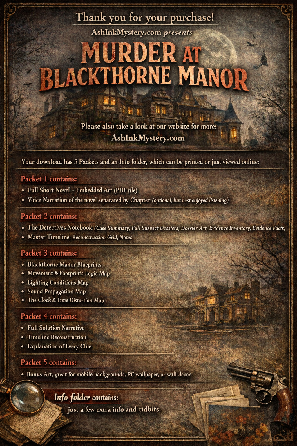 {"id":9273613648040,"title":"Murder at Blackthorne Manor with Voice Narration Deluxe Digital Download Now","handle":"murder-at-blackthorne-manor-deluxe-digital-download-now","description":"\u003ch2 data-end=\"225\" data-start=\"190\"\u003eš Murder at Blackthorne Manor\u003c\/h2\u003e\n\u003ch3 data-end=\"275\" data-start=\"226\"\u003eA Solve-It-Yourself Murder Mystery Experience\u003c\/h3\u003e\n\u003cp data-end=\"387\" data-start=\"277\"\u003eStep into a storm-lashed Victorian estate where secrets echo through candlelit halls and every detail matters.\u003c\/p\u003e\n\u003cp data-end=\"563\" data-start=\"389\"\u003e\u003cstrong data-end=\"420\" data-start=\"389\"\u003eMurder at Blackthorne Manor\u003c\/strong\u003e\u003cspan\u003eĀ \u003c\/span\u003eis a fully immersive, downloadable murder mystery designed for readers who want more than a story ā they want to\u003cspan\u003eĀ \u003c\/span\u003e\u003cem data-end=\"562\" data-start=\"534\"\u003esolve the crime themselves\u003c\/em\u003e.\u003c\/p\u003e\n\u003cp data-end=\"618\" data-start=\"565\"\u003eYou are not handed answers.\u003cbr data-end=\"595\" data-start=\"592\"\u003eYou are given evidence.\u003c\/p\u003e\n\u003chr data-end=\"623\" data-start=\"620\"\u003e\n\u003ch2 data-end=\"647\" data-start=\"625\"\u003ešÆļø Whatās Included\u003c\/h2\u003e\n\u003cp data-end=\"763\" data-start=\"649\"\u003eThis digital experience contains\u003cspan\u003eĀ \u003c\/span\u003e\u003cstrong data-end=\"762\" data-start=\"682\"\u003eeverything you need to investigate, analyze, and ultimately solve the murder\u003c\/strong\u003e:\u003c\/p\u003e\n\u003ch3 data-end=\"796\" data-start=\"765\"\u003eš\u003cspan\u003eĀ \u003c\/span\u003e\u003cstrong data-end=\"796\" data-start=\"772\"\u003eThe Full Short Novel\u003c\/strong\u003e\n\u003c\/h3\u003e\n\u003cp data-end=\"1014\" data-start=\"797\"\u003eA richly written mystery that unfolds in real time inside Blackthorne Manor. Follow the storm, the guests, and the final moments leading to Dr. Edgar Blackthorneās death ā all presented without revealing the solution.\u003c\/p\u003e\n\u003ch3 data-end=\"1042\" data-start=\"1016\"\u003eš§\u003cspan\u003eĀ \u003c\/span\u003e\u003cstrong data-end=\"1042\" data-start=\"1023\"\u003eVoice Narration\u003c\/strong\u003e\n\u003c\/h3\u003e\n\u003cp data-end=\"1176\" data-start=\"1043\"\u003eOptional narrated audio brings the story to life, perfect for listening alone or playing aloud during a group investigation night.\u003c\/p\u003e\n\u003ch3 data-end=\"1214\" data-start=\"1178\"\u003ešļø\u003cspan\u003eĀ \u003c\/span\u003e\u003cstrong data-end=\"1214\" data-start=\"1186\"\u003eThe Detectiveās Notebook\u003c\/strong\u003e\n\u003c\/h3\u003e\n\u003cp data-end=\"1381\" data-start=\"1215\"\u003eYour personal case file ā packed with suspect dossiers, character backgrounds, space for notes, and investigative prompts to track motives, lies, and inconsistencies.\u003c\/p\u003e\n\u003ch3 data-end=\"1430\" data-start=\"1383\"\u003eš°ļø\u003cspan\u003eĀ \u003c\/span\u003e\u003cstrong data-end=\"1430\" data-start=\"1391\"\u003eMaster Timeline Reconstruction Grid\u003c\/strong\u003e\n\u003c\/h3\u003e\n\u003cp data-end=\"1573\" data-start=\"1431\"\u003eA structured worksheet that allows you to rebuild the night minute by minute, aligning movements, alibis, power outages, and critical moments.\u003c\/p\u003e\n\u003ch3 data-end=\"1615\" data-start=\"1575\"\u003ešļø\u003cspan\u003eĀ \u003c\/span\u003e\u003cstrong data-end=\"1615\" data-start=\"1583\"\u003eBlackthorne Manor Blueprints\u003c\/strong\u003e\n\u003c\/h3\u003e\n\u003cp data-end=\"1772\" data-start=\"1616\"\u003eDetailed, canon-accurate floor plans of the manor ā ground floor and upper floor ā essential for understanding movement, sound, sightlines, and opportunity.\u003c\/p\u003e\n\u003ch3 data-end=\"1808\" data-start=\"1774\"\u003eš§\u003cspan\u003eĀ \u003c\/span\u003e\u003cstrong data-end=\"1808\" data-start=\"1781\"\u003eForensic Deduction Maps\u003c\/strong\u003e\n\u003c\/h3\u003e\n\u003cp data-end=\"1850\" data-start=\"1809\"\u003eA set of atmospheric logic maps covering:\u003c\/p\u003e\n\u003cul data-end=\"1989\" data-start=\"1851\"\u003e\n\u003cli data-end=\"1874\" data-start=\"1851\"\u003e\n\u003cp data-end=\"1874\" data-start=\"1853\"\u003eMovement \u0026amp; footprints\u003c\/p\u003e\n\u003c\/li\u003e\n\u003cli data-end=\"1910\" data-start=\"1875\"\u003e\n\u003cp data-end=\"1910\" data-start=\"1877\"\u003eSound propagation \u0026amp; storm masking\u003c\/p\u003e\n\u003c\/li\u003e\n\u003cli data-end=\"1952\" data-start=\"1911\"\u003e\n\u003cp data-end=\"1952\" data-start=\"1913\"\u003eLighting conditions during the blackout\u003c\/p\u003e\n\u003c\/li\u003e\n\u003cli data-end=\"1989\" data-start=\"1953\"\u003e\n\u003cp data-end=\"1989\" data-start=\"1955\"\u003eClock stoppage \u0026amp; time distortion\u003c\/p\u003e\n\u003c\/li\u003e\n\u003c\/ul\u003e\n\u003cp data-end=\"2041\" data-start=\"1991\"\u003eThese maps transform clues into visual deductions.\u003c\/p\u003e\n\u003ch3 data-end=\"2087\" data-start=\"2043\"\u003eāļø\u003cspan\u003eĀ \u003c\/span\u003e\u003cstrong data-end=\"2087\" data-start=\"2050\"\u003eThe Full Solution (Sealed Reveal)\u003c\/strong\u003e\n\u003c\/h3\u003e\n\u003cp data-end=\"2127\" data-start=\"2088\"\u003eA comprehensive final packet revealing:\u003c\/p\u003e\n\u003cul data-end=\"2254\" data-start=\"2128\"\u003e\n\u003cli data-end=\"2142\" data-start=\"2128\"\u003e\n\u003cp data-end=\"2142\" data-start=\"2130\"\u003eThe murderer\u003c\/p\u003e\n\u003c\/li\u003e\n\u003cli data-end=\"2155\" data-start=\"2143\"\u003e\n\u003cp data-end=\"2155\" data-start=\"2145\"\u003eThe method\u003c\/p\u003e\n\u003c\/li\u003e\n\u003cli data-end=\"2170\" data-start=\"2156\"\u003e\n\u003cp data-end=\"2170\" data-start=\"2158\"\u003eThe motive\u003c\/p\u003e\n\u003c\/li\u003e\n\u003cli data-end=\"2254\" data-start=\"2171\"\u003e\n\u003cp data-end=\"2254\" data-start=\"21